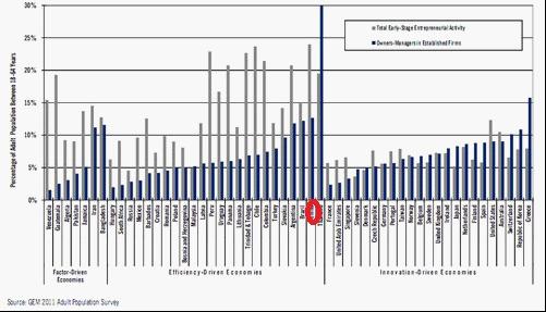 2012年1月,GEM(The Global Entrepreneurship Monitor,全球創業觀察組織)發布了全球創業觀察2011全球報告(2011 Global Report)。該報告表明:在動蕩的經濟環境下,不管是為了基本的生存還是為了實現雄心壯志,全球創業者一起為2011年描上了充滿豪情和希望的一筆。