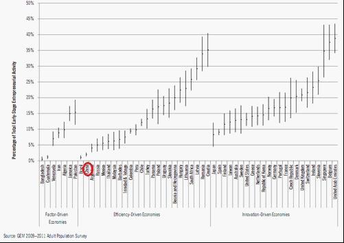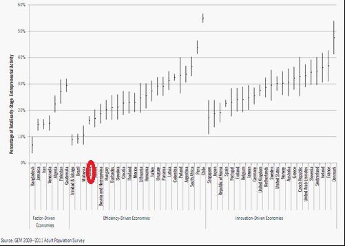 當然,不可忽視的一個背景是:在2011年,各國平均TEA指數均有所提高。“時勢造英雄”,在不利的經濟周期中,人們更傾向于以自身努力尋找發展機會,實現創業夢想,并抵抗下滑經濟周期帶來的沖擊。