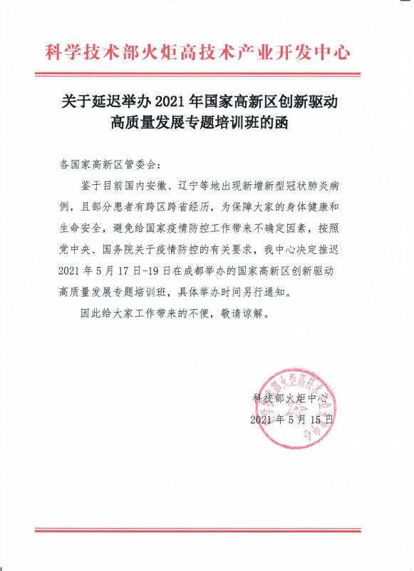 關于延遲舉辦2021年國家高新區創新驅動高質量發展專題培訓班的函