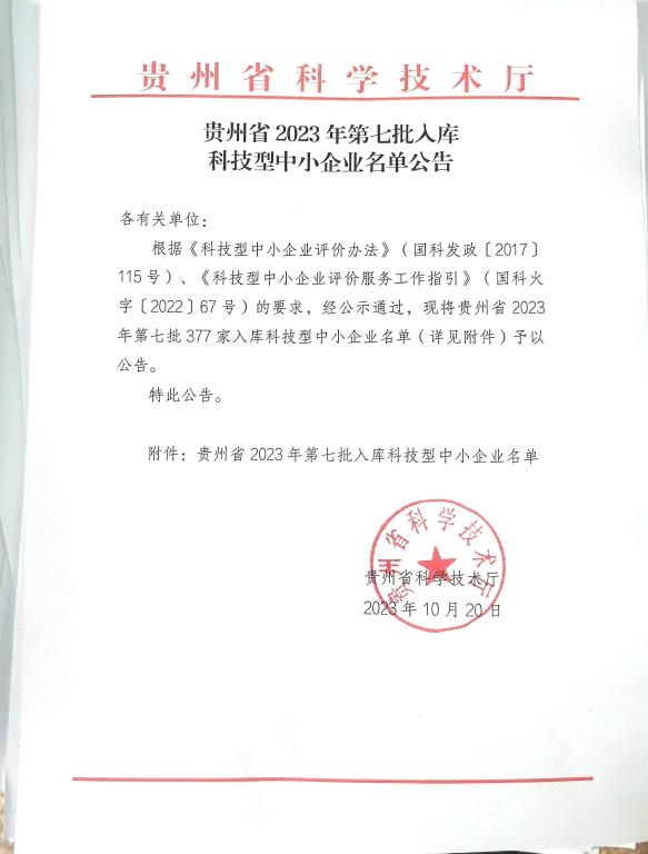 貴州省2023年第7批入庫科技型中小企業名單公告正文.jpg PICTURE